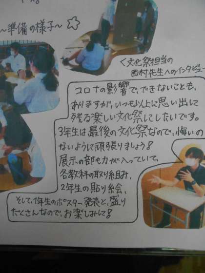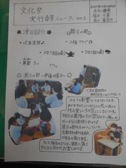 第2号が出ました。実行委員会は生徒会役員の人たちが先頭でがんばっています。「コロナの影響はあるが、いつも以上に思い出に残る文化祭に」と書いてあります。そのとおりですね。昨日に続いての第2号です。すばらしい。