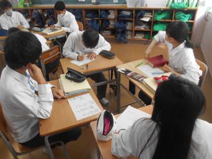 3年の国語です。自分の作った俳句に絵を描いています。おもしろい(興味深いという意味で)ものが多いです。