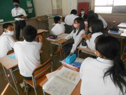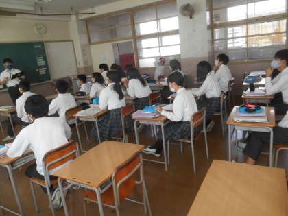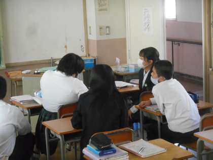 「じゃ、グループで確認しよう。」という時間です。生徒たちは毎日のことなので、ごく自然に自分の意見を言い、人の意見を聞きます。そして、場合によっては、人の意見を取り入れて新たな考えを創出します。すばらしい。これだけで、主体的、対話的で深い学びが完成しているとは言いませんが、それを強く意識して授業が進められています。