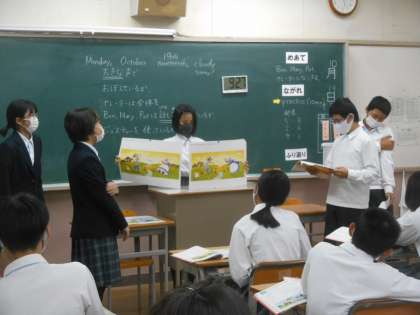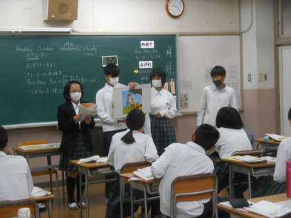 ジェスチャーや感情がこもった会話がありました。英文を覚えている人も多く、これぞ、英語の授業と思える内容でした。すばらしい。