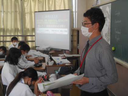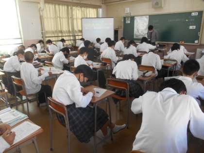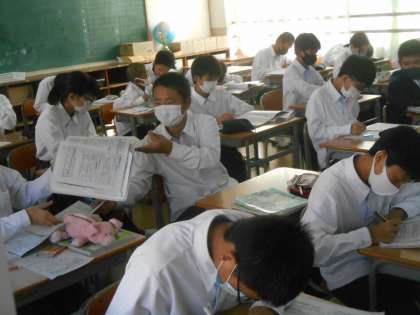 貿易について学んでいました。個人思考が終わって、隣の人と交換して相互評価するところでした。