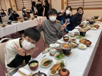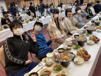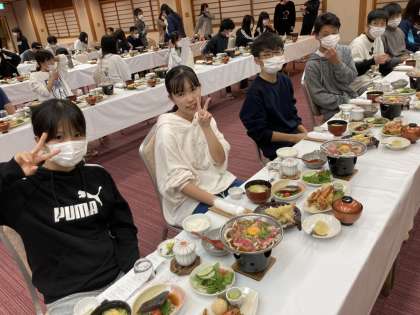 写真は夕食風景です。現在、9時40分です。クラス別に語る会をやっているところです。発言内容までは聞こえませんが、発言があると大きな拍手が起こっています。