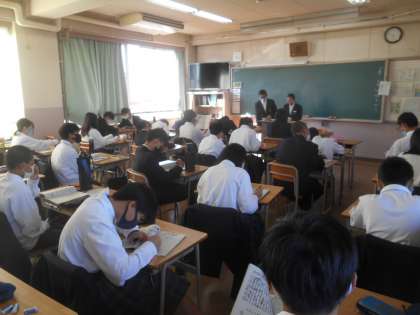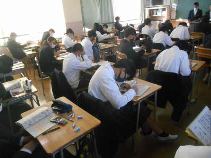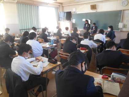 1年の学活です。6日(金)にある校外学習に向けて学級委員が前に立ち、いろいろと説明しているところです。中学校になると、より一層、生徒が学校行事を創っていく度合いが高まります。