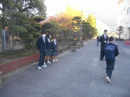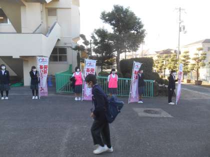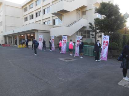 今日も生徒会、報道委員の3年生、そして先生たちとあいさつ運動に参加しました。