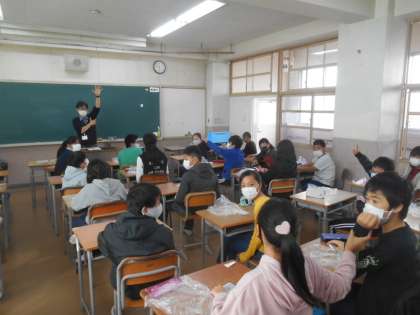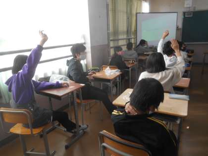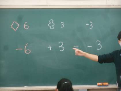 これは数学(算数)の授業の様子です。トランプの赤(マイナス)、黒(プラス)を出し合って、正負の数の計算を勉強しました。集中して取り組んでいました。
