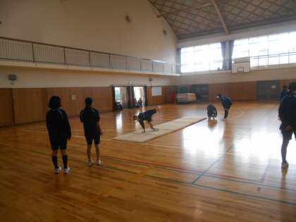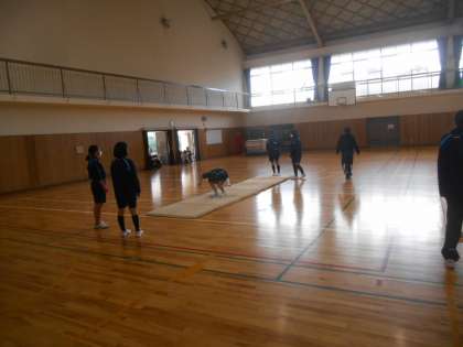 マット運動です。今日は連続技を練習していました。開脚前転、後転などの技を連続して行います。