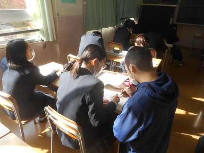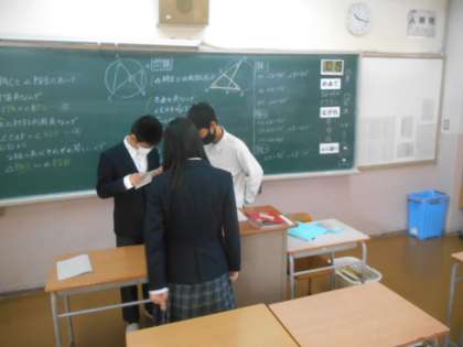 章末問題を解いています。「ここ、なんでこうなるの?教えて。」とクラスメイトに聞きに行く生徒もいました。教える方も理解が定着します。