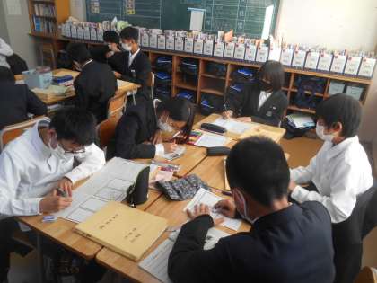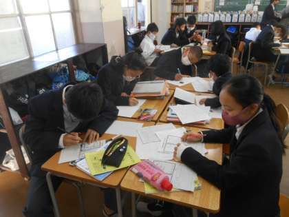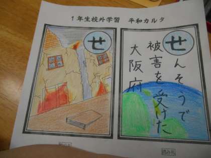 1年生もとてもいい授業をしていました。先日のピースおおさかの見学を受けて平和学習を継続しています。今日は平和かるたを考えていました。すばらしいと思います。