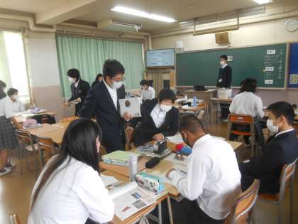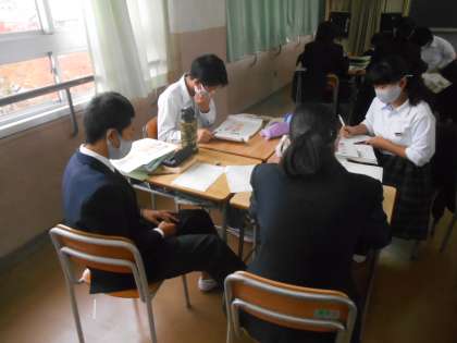 ジグソーの第2ステージです。専門家グループが集まりました。専門家とは、同じことを調べた人たちのことです。今日の授業ではオランダ、琉球、韓国などについて調べていました。専門家同士で、大事なことを理解しているか、もれていないか確認しています。
