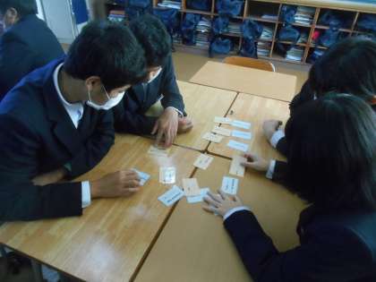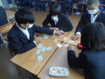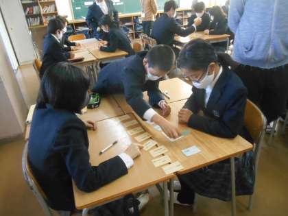 2年生の英語です。英語のカルタが登場しました。内容を読み取ってペアにする作業をしているところです。いろいろ工夫していますね。遊びながら賢くなるのはすばらしい。