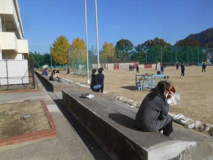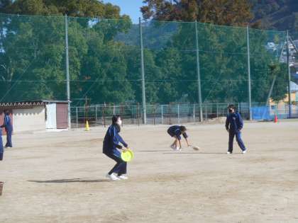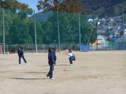 1年生の女子体育です。アルティメットの授業が始まりました。今日は秋晴れのさわやかな天気で気持ちが良いです。フライングボード(フリスビー)を写そうと思うのですが、安物のカメラなのでうまくいきません。