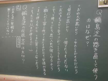 1年の道徳です。伝統文化って何でしょう。みんなで考えてみました。道徳なので、答えは一つではありません。黒板いっぱいにみんなの意見が書かれていました。