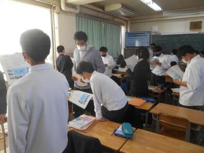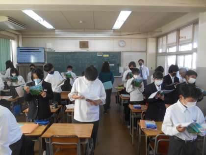 3枚の写真で一つのことを表しています。教科書の英文を1回目は廊下側を向いて、2回目は後ろの黒板を向いて、3回目は廊下の反対側を向いて読んでいます。3回読むと着席です。しっかり読んでいました。