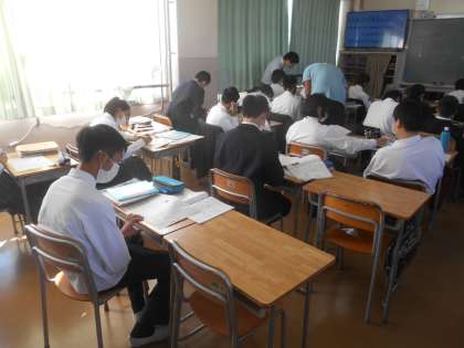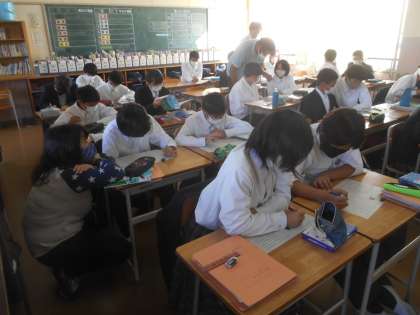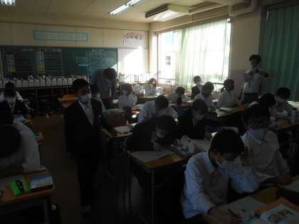 1年生の英語です。Whichを習いました。その使い方を知り、プリントの問題に取り組んでいます。できた人から次のプリントにチャレンジしています。