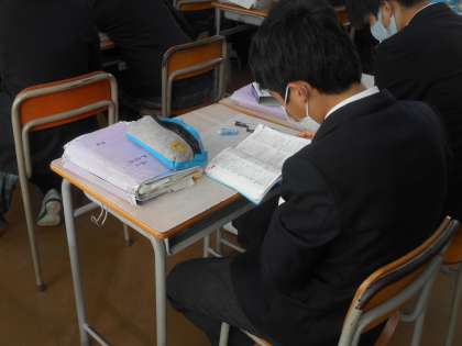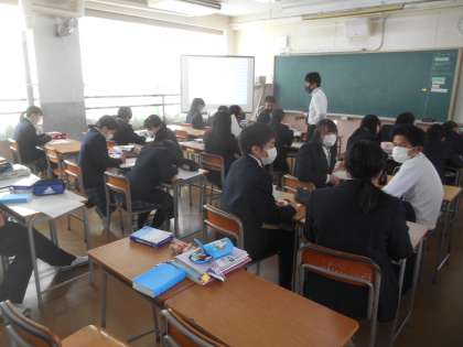 3年生の英語です。全員が辞書を片手に調べ物をしているので、何かと見てみると、関係代名詞を活用してクイズづくりをしていました。なかなかやりますね。すばらしい。