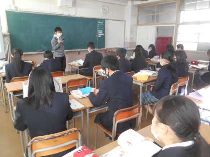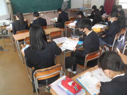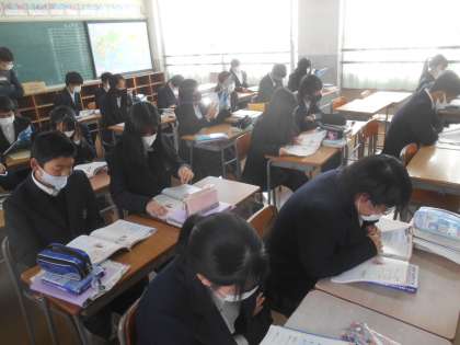 3年生の英語です。関係代名詞を習い、それを使ってクイズを作ります。写真は、まず英文をしっかり発音するところから勉強しています。