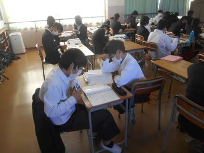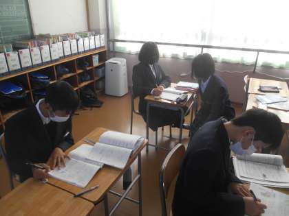 この授業もテスト前の勉強時間でした。先生にも質問し、自分たちでも教え合いながらの授業でした。
