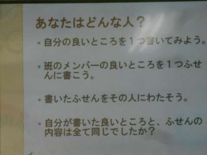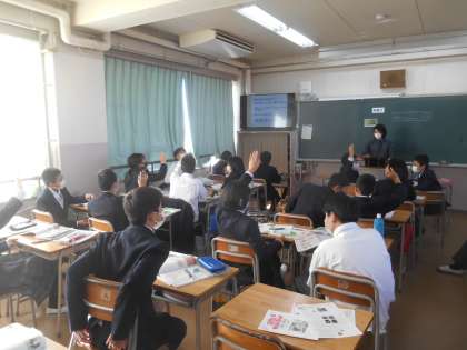 1年生の保健の時間です。自分のいいところを書き、クラスメイトのいいところも書きました。2枚目、よく見ると挙手している生徒が何人もいるのですが、「自分が思いもよらなかった長所」をクラスメイトに書かれた人です。うれしかったでしょうね。
