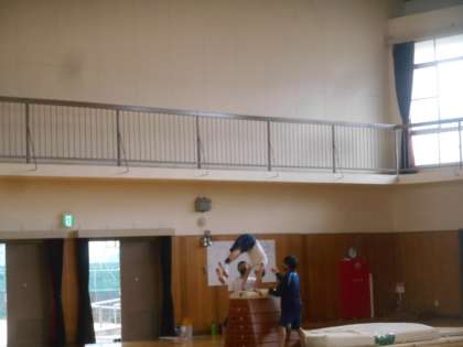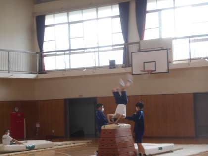2年生の男子体育です。台上前転?の練習をしていました。恐怖心がある人は台を低くして練習していました。