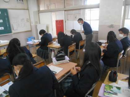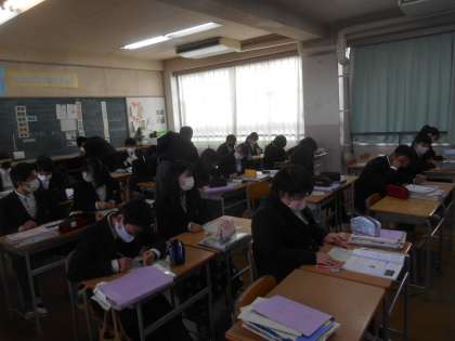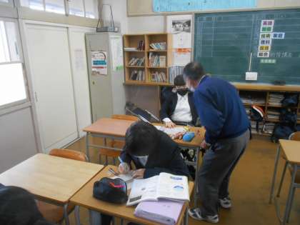 3年生の理科です。天体の勉強で、一日の星の動きについて説明を聞き、問題にあたっているところです。先生が一人ひとりの進み具合を見て回っていました。