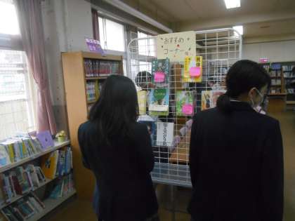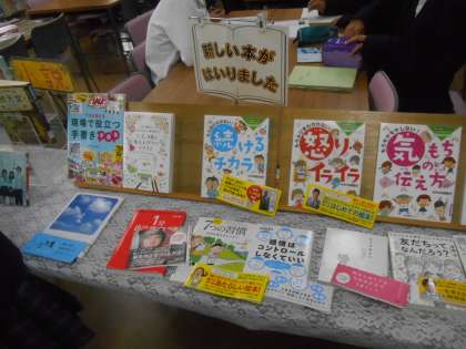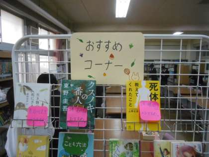図書担当の先生と図書委員さんたちががんばってくれるので、「おすすめコーナー」や「新刊本コーナー」が設置されています。とても分かりやすいです。自慢の図書室です。今日も担当の図書委員が本の貸し出し業務を自分たちだけでやっていました。