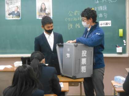 公約用紙を見比べ、自分が選んだ候補者に投票しています。1枚目は何をしているのでしょうか。それは、一人目の投票者には投票箱の中を見てもらうそうです。本当の選挙でもやります。からっぽであることを目で確認しているそうです。この社会の先生も実際に選挙でそれを体験しようと、7時30分に会場についたら、おじいさんがすでに先に並んでおられたとか。
