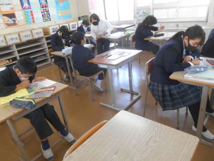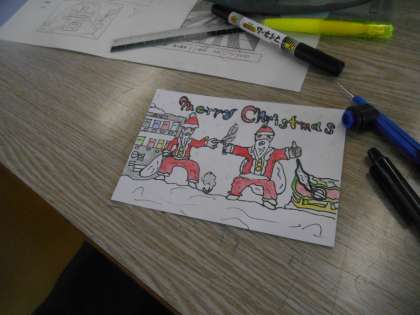 はがきにチャレンジという授業でした。年賀状やクリスマスカードを制作しています。2枚目はサンタクロースの絵を丁寧に描いていました。(本人の許可を得てアップしています。)
