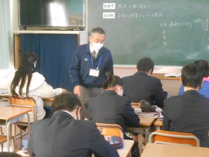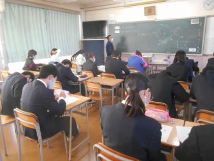 写真は3年生の理科です。教室内ですが、本日より防寒着を許可しました。理由は、大阪府の新型コロナ対応が「赤信号」に変わったことを受け、換気の徹底を図る必要があると判断しました。さらに、大東市教育委員会より「地域の感染レベル1から2に移行する。」と通知が来ました。常に換気をするということで教室内も温かくならないので、防寒着着用を許可しました。また、教室では空気清浄器も生徒がいる間は常にオンにしています。