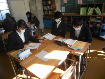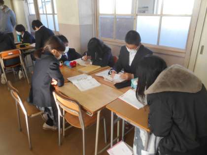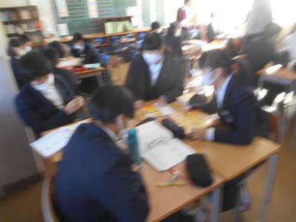 2年生の英語です。教科書の英語の台本を使って、役を決めて班ごとに練習ののち、発表しているところです。スムーズに発表できていました。AETの先生からもイントネーション(強弱)がうまくてきているとほめてもらいました。すばらしい。