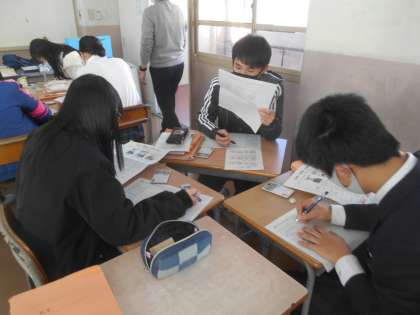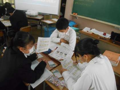 3人の立候補者の公約用紙を検討しなおしています。その際、今日先生から渡された、北条村の財政状況を書いた用紙が決めてとなります。仮想の話ですが、歳入(村の収入)が40億円、負債(村の借金)が30億円の設定です。この村でどれだけの政策が打てるのか、その中でも、やっぱりこれだけはやってほしい、というものを考えています。写真に写っているグループは、普段のグループからA候補、B候補、C候補担当に分かれて、その候補ごとに公約の実現性を検証しているところです。