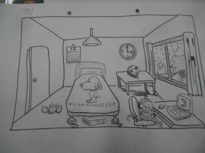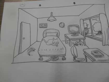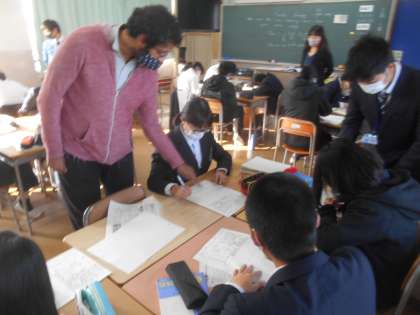斬新な展開でドキドキしました。2年生の英語です。AETの先生が似ていますが異なる絵を2枚描きました。それを各3つの班に配りました。それを生徒たちは机の上にテレビがあるとか犬がいるとか英語で文を作りました。
