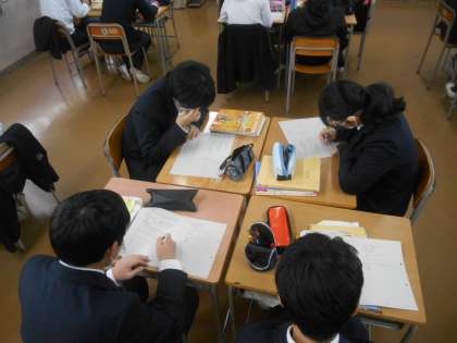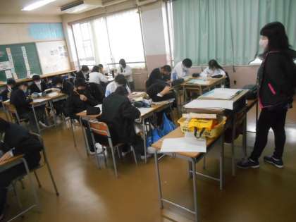 3学期に入ってすぐにある府のチャレンジテストの対策をしています。今日はヒアリングテストの過去の問題をやっているところでした。