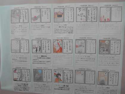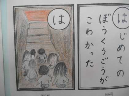 1年生がすばらしい取り組みをしました。11月の校外学習でピース大阪で平和について学びました。その延長として、学校に帰ってから平和かるたを作りました。言葉と絵を自分たちで完成させました。