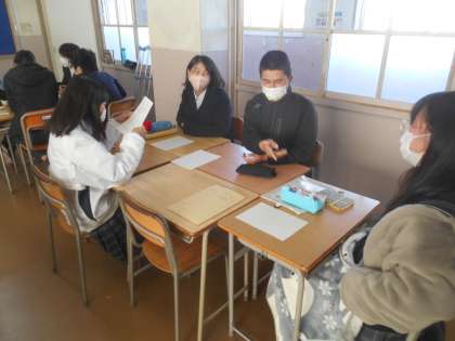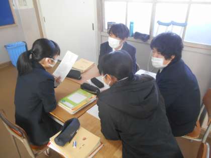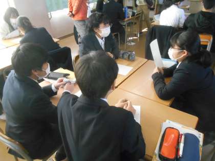 2年生の英語の授業です。生徒の笑顔がマスク越しに見えますか。英語の先生が英文でクイズをいくつも用意しました。その答え方も事前に説明を受けた上で、写真は班員同士でクイズを出して、誰が早く答えるかを競っています。競うというと、こわいですが、楽しんでいます。見ていて、どの子も笑顔になっているので、こちらまでうれしくなりました。