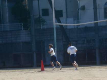 2年生の男子体育です。器械体操が終わり、持久走が始まりました。走っている姿が写っていますが、生徒たちの応援の声がすごいのです。胸が熱くなりました。