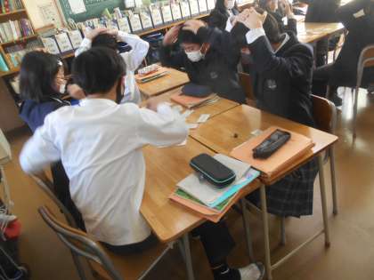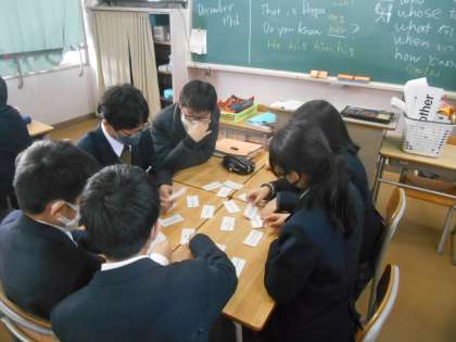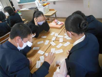 1年生の英語です。英会話のフレーズをペアにしたカードが2枚一組で何種類か配られています。How are you?に対して、I fine thank you.と答えるようなペアです。かるたを始める前に、そのペアを確認してから、かるたがスタートしました。