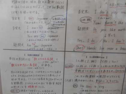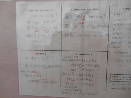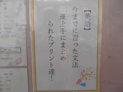 1年生の教室前廊下に掲示してありました。英語で文法についていろいろ学びました。それらをプリントにまとめる課題がありました。その中の優秀作です。写真では分かりにくいですが、掲示されるだけあって(ここの乗っていない人も含めてすべて)すばらしいです。