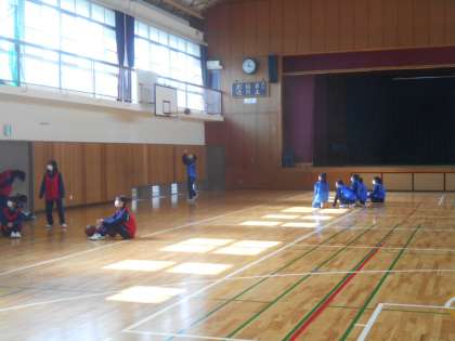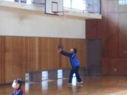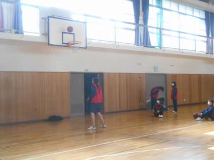 3年生の女子体育です。時間内にどれだけシュートが入るかやっているところです。