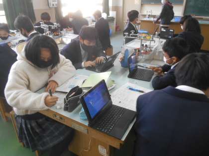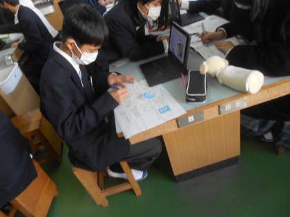 1年の理科です。タブレットを活用していたので、長く見ました。「状態変化を粒子のモデルで説明する。」という難しそうな授業でしたが、生徒たちは指示に従い、自分の頭も使い、勉強が進んでいました。
