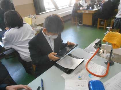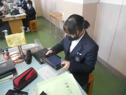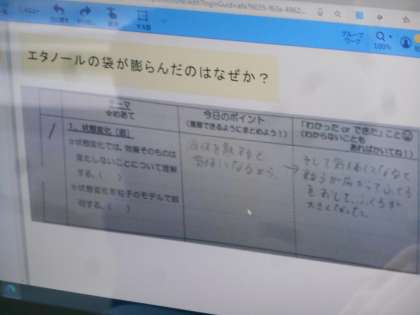 写真は、自分が書いた振り返り用紙の記述の部分をタブレットで撮影し、それをデータで先生のタブレットに転送しているところです。