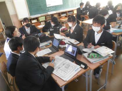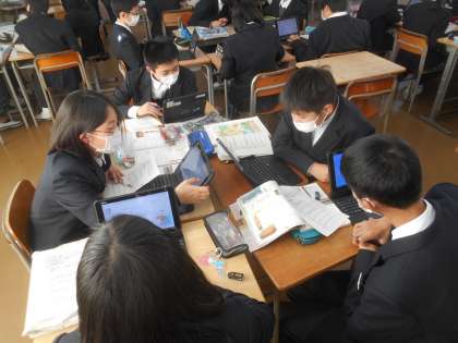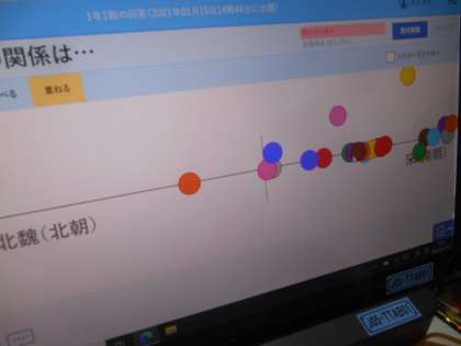 この社会の先生と授業後に「先生、すごいですね。タブレットで積極的に調べている生徒が何人もいましたよ。」と校長が言うと、「これ見てください。」と言って見せてくれたのが、3枚目の写真です。これは何かというと、北魏と南宋(昔の国名)がどちらが進んでいるかということを生徒にPC上で投票させたとのこと。一人が一つの丸印を自分のパソコン上で入力すると、先生のパソコンには全員の「一票」が一度に出ます、とのこと。おもしろいですねー。すばらしい。でも、今日の授業中に先生は「あのな、みんな、タブレットを使いたくなるのはよく分かるけど、教科書はやっぱり大事やぞ。教科書も見るように」と言っていました。こうやって、タブレットの長所や短所が分かってくるのも大事なことだと思います。