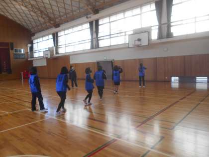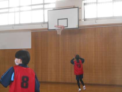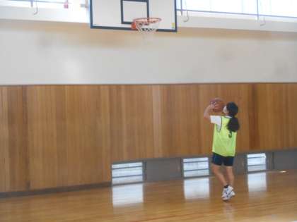 体育館でのバスケットボールでシュート練習です。今日はランニングシュートの練習でした。