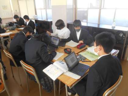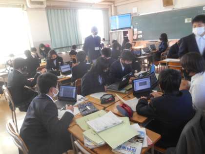 他の授業でも使っていることもあって、生徒たちもタブレットPCに少し慣れてきました。今日は、グループごとにデータ上で考えたことを共有するのですが、自分のグループ番号を間違って入力してしまうと、違うグループに入ってしまい、「あれ、〇〇、なんでうちのグループに来てるの?」という場面がありました。しかし、発展的にはグループを超えて交流することもありますので、あながち間違いではありません。