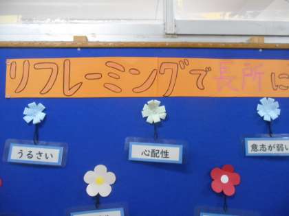 保健室前の廊下です。ここには元気になる情報がいつも出てきます。この前はセロト忍者でした。今日はリフレーミングといって、何事も見方を変えると長所にも短所にもなるという話です。「心配性」は別の見方だと「慎重」ということで長所になります。一度、保健室前の掲示板を見てくださいね。