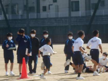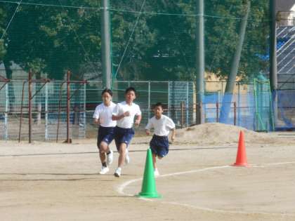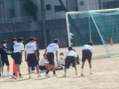 1年生の男子体育です。今日は800m走のタイムを計っていました。やはり、15分間走と比べるとスピードがずいぶん違います。速いです。