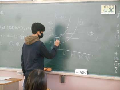 今日の授業も興味深く見学しました。問題を解き、班ごとに解答と説明が割り当てられ、代表の人は前に出て説明していました。「主体的に学習する態度」を一つの観点とする新学習指導要領のねらいにドンピシャの授業展開でした。また、生徒たちもよく聞いていました。すばらしい。