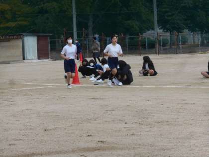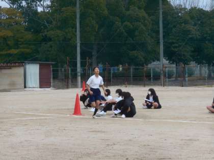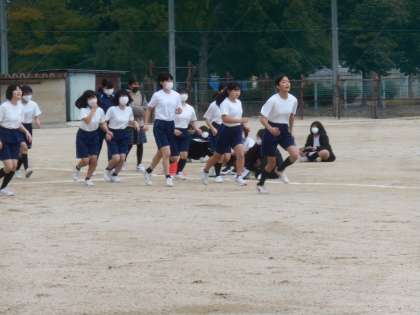 2年生の女子体育です。スタートと共にぐんぐんスピードに乗って走ります。すごいです。