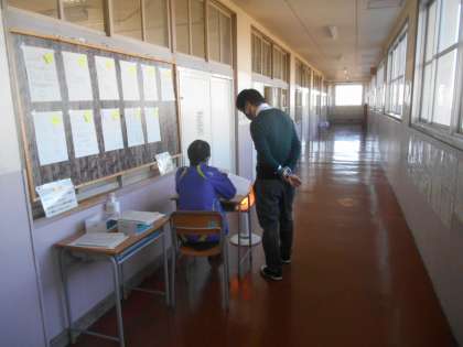 1時間目の実力テストの様子です。廊下当番の先生がスタンバイして、不慮の出来事に備えています。