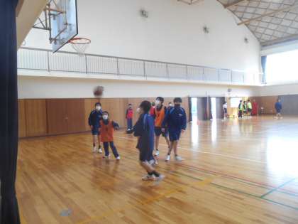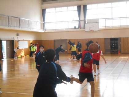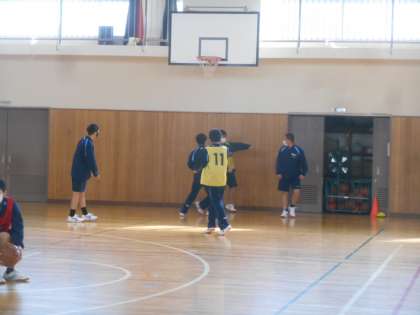 1年生のバスケットはコートを半分にして、ゴール下で攻めるチームと守るチームを決めて練習していました。良く動いていたように思います。