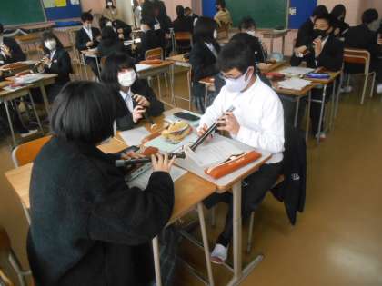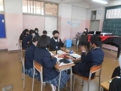 まず、ドレミファソラシドで「あなたに」を歌いました。それができないとリコーダーを吹けません。次にグループで指使いの確認をしていました。実際に吹くときは対面ではやりません。